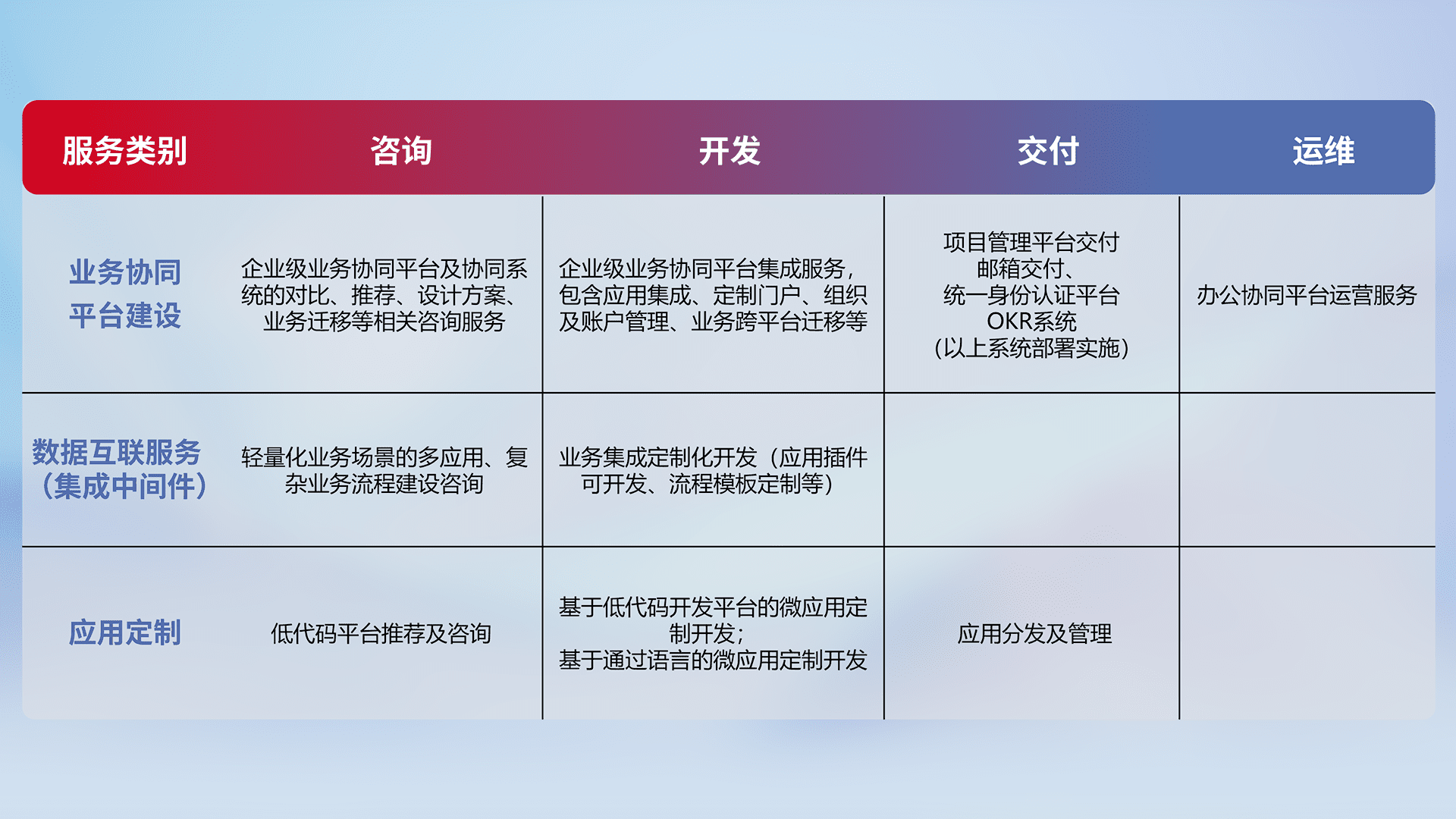 针对钉钉、、、、企微、、IDaas等平台级产品提供产品的规划、、、方案、、、、交付、、、定制化开发等服务,,实现如统一协同办公、、、、智能客户服务、、、混合会议管理、、智能数据查询、、、等业务场景,,,实现数字化转型。。。。