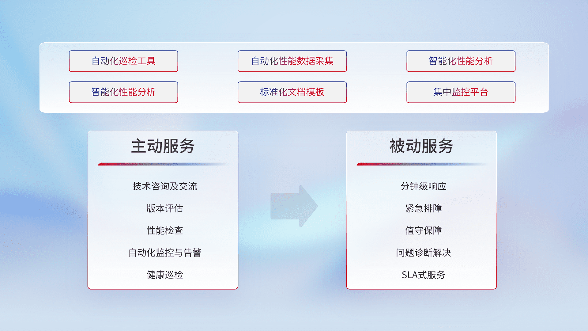 智能化工具和标准化文档,,保障服务质量,,,,提供主动服务(包含技术咨询、、、、版本评估、、、、性能检查、、、、自动化监控与告警、、、健康巡检)和被动服务包含(分钟级响应、、、、紧急排障、、、、值守保障、、、问题诊断解决、、SLA服务)。。
