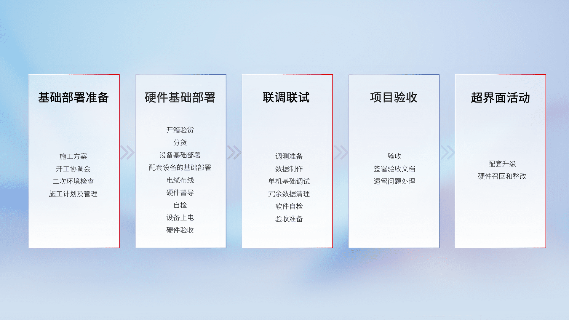 从基础部署准备、、硬件基础部署、、、、联调联试、、、、项目验收、、、、越界面活动的全过程可追溯,,,保证施工质量和进度。。。